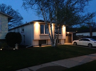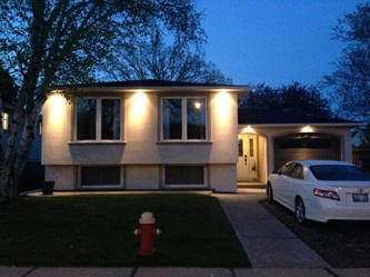 New soffit pot lights located on the front of a freshly updated house (side view).